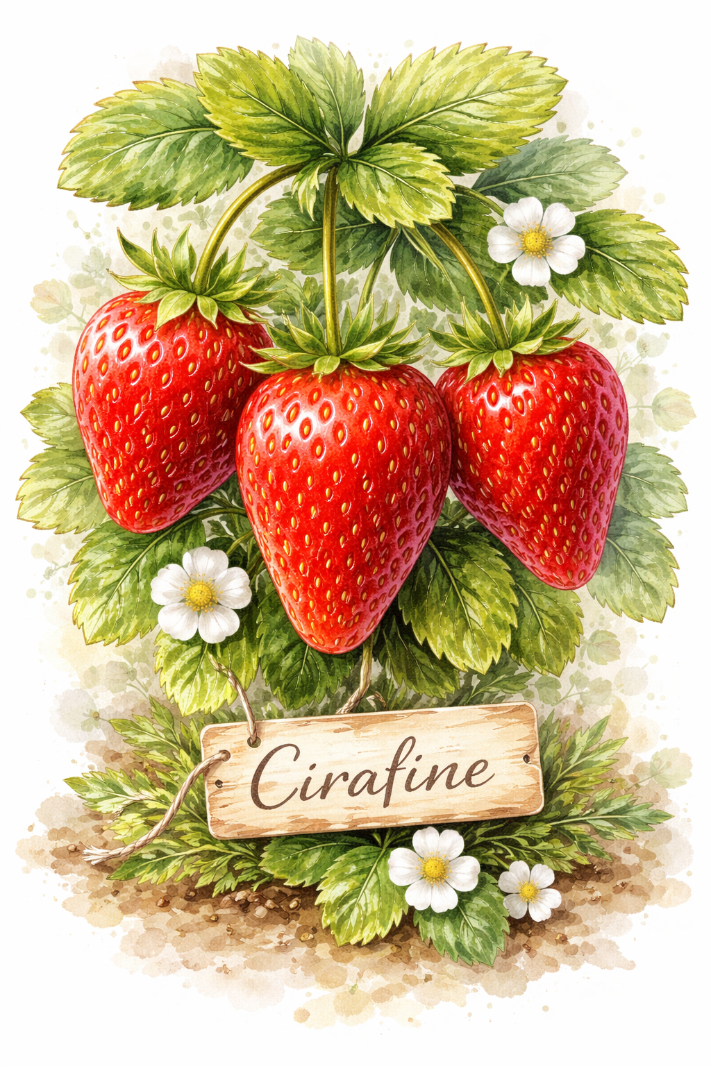 Le fraisier Cirafine est une variété non remontante reconnue pour la qualité exceptionnelle de ses fruits, proches de la fraise des bois par leur arôme intense et très sucré. Ses fraises sont de taille moyenne, de forme régulière, à la chair rouge vif, ferme et juteuse.