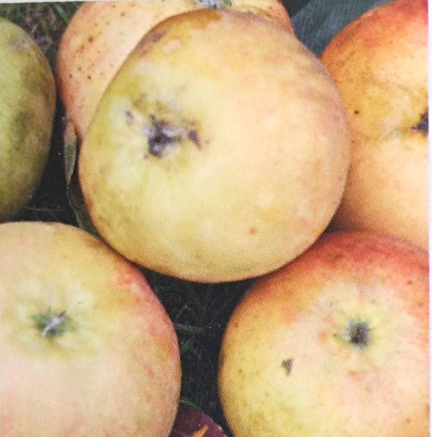 Le fruit est de calibre moyen, jaune, lavé de rouge, aplati et arrondi, parfois un peu conique vers le sommet.