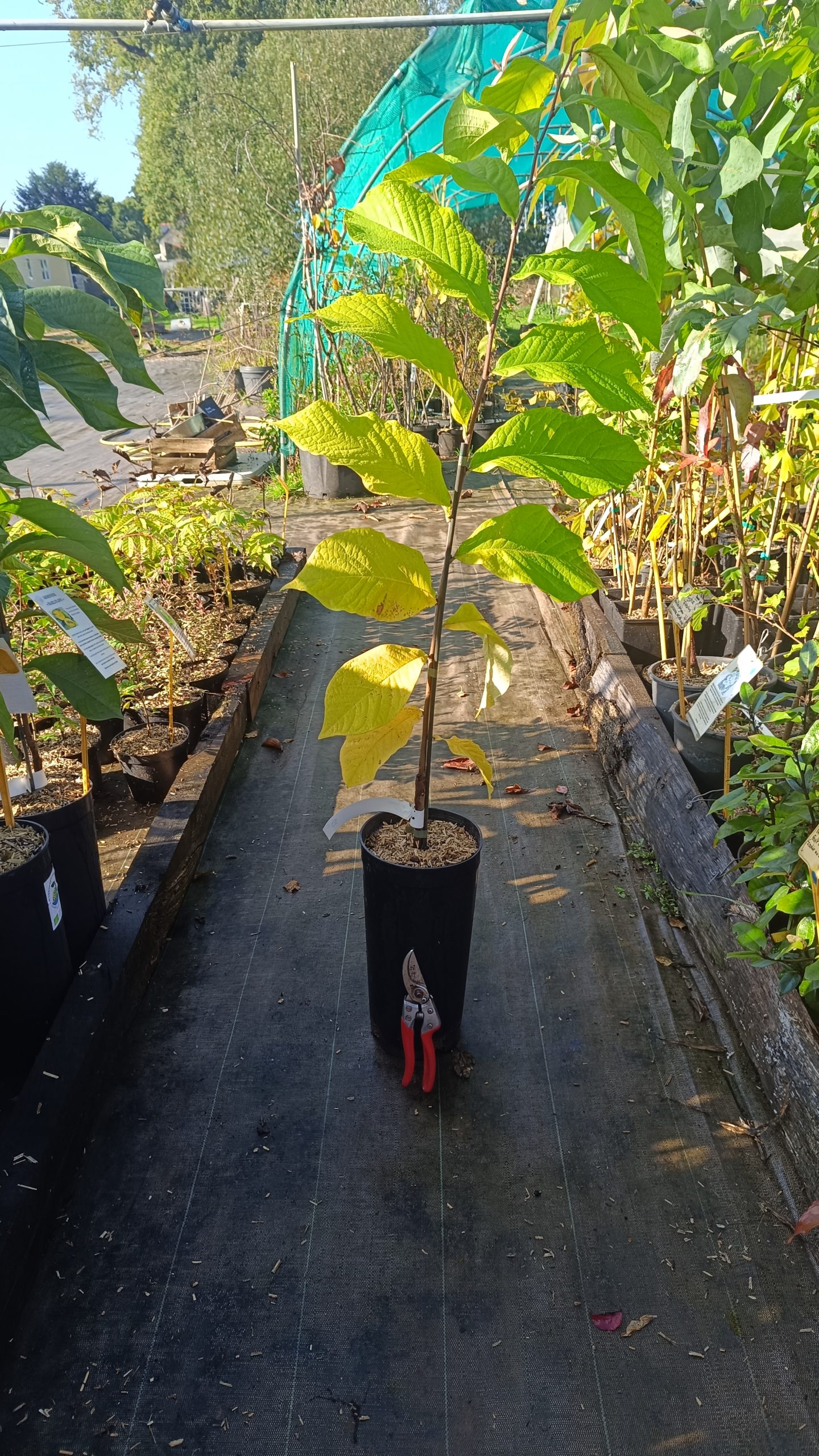 Caractéristiques de l’Arbre : C’est un arbre à feuilles caduques qui peut atteindre une hauteur de 4 à 5 mètres. Ses feuilles sont larges, ovales et peuvent atteindre jusqu’à 30 cm de long. En été, l’arbre produit des fleurs jaunes ou violettes qui sont pollinisées par des insectes macrophages (mouches, coléoptères, petits scarabées, fourmis).